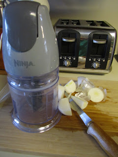 Ninja - our best purchase EVER! The Ninja is awesome. And to think I was a little worried when I bought it, as I had not consulted with my husband over the purchased, even though it only cost about $30 or $40 (from WalMart). Ours came with two chopping containers - one small and one larger one. They are perfect, and we use them all the time. I originally purchased it for my husband soI could get out of chopping up his hot peppers he could chop up his hot peppers! (This decision was reached when I had spent hours one day chopping them up to freeze, and my hands burned for two days after. Umm...who forgot to mention you should wear gloves!?!?!). Anyway, the Ninja makes light work of chopping anything. I quartered the onion, plopped it in the Ninja, two quick pulses and it was all done! QUICK and EASY :)
